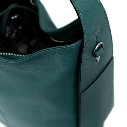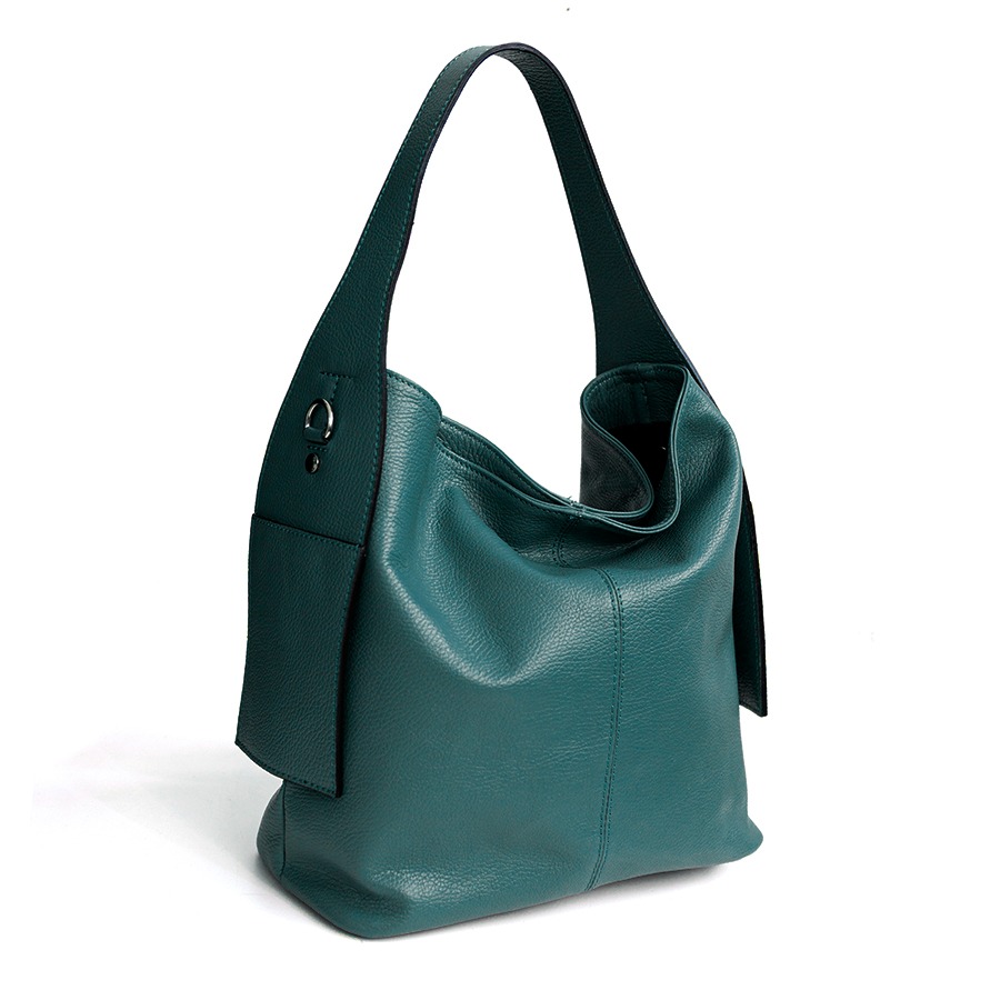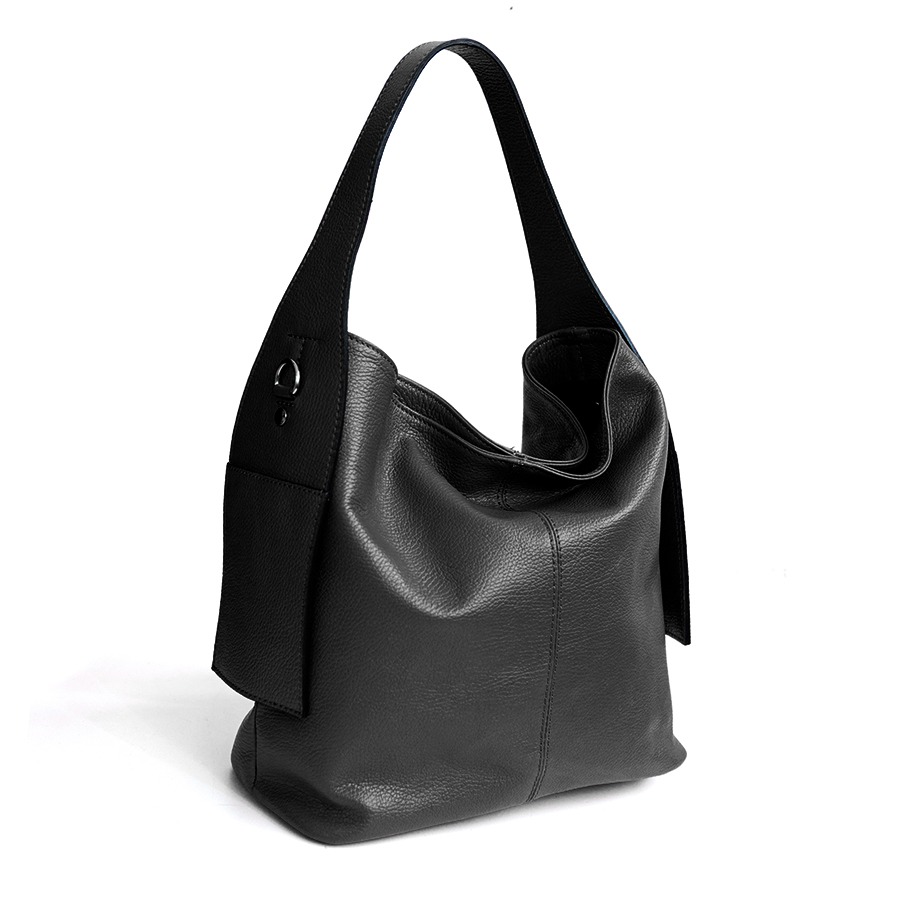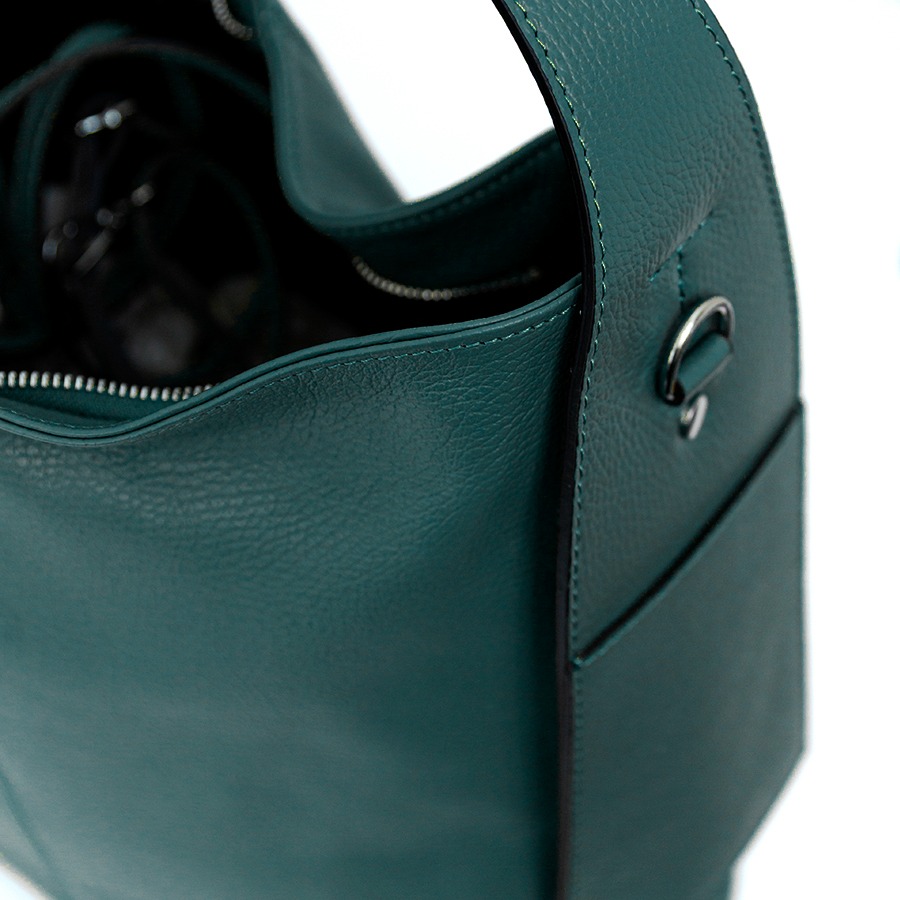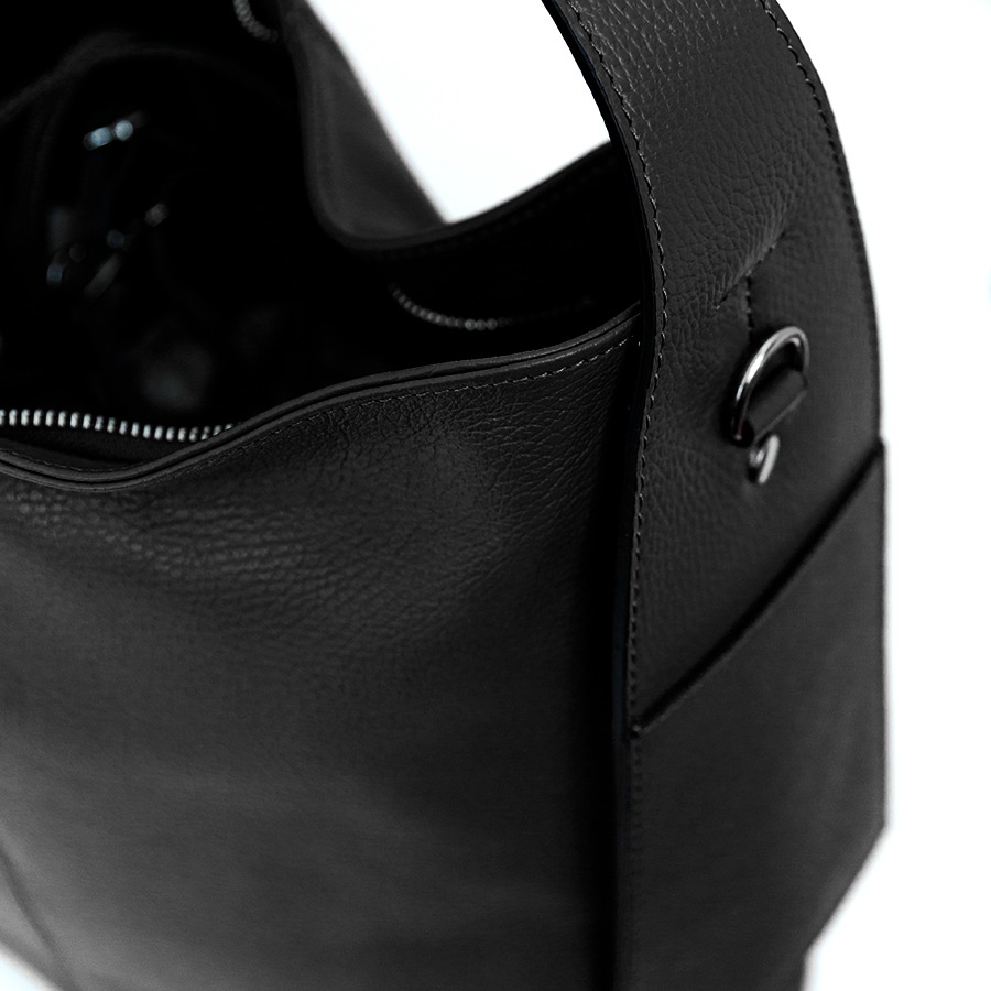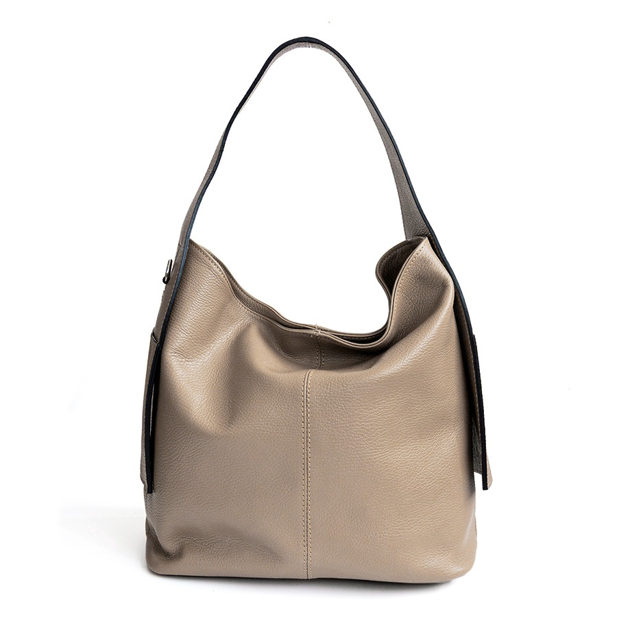 Sacca di grandi dimensioni a spalla, pratica e sportiva in pelle dollaro. Chiusura a zip con funzionali tasche esterne applicate sul manico. Tracolla applicabile. Accessori colore argento, piedini sul fondo e interno foderato
