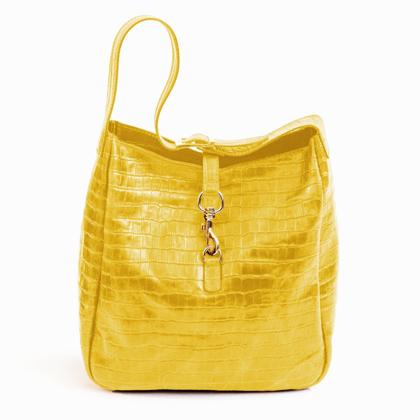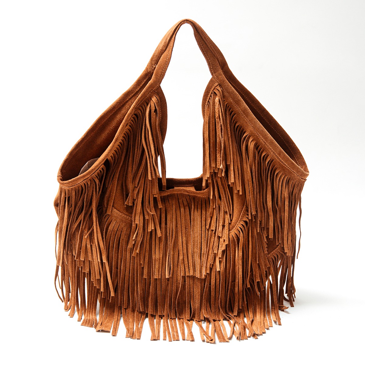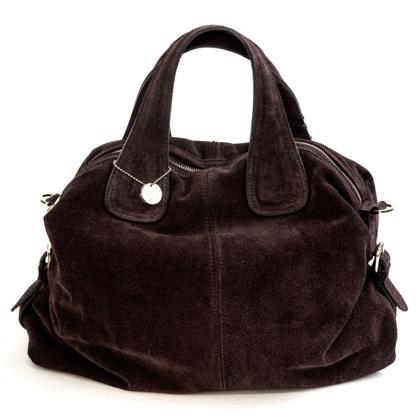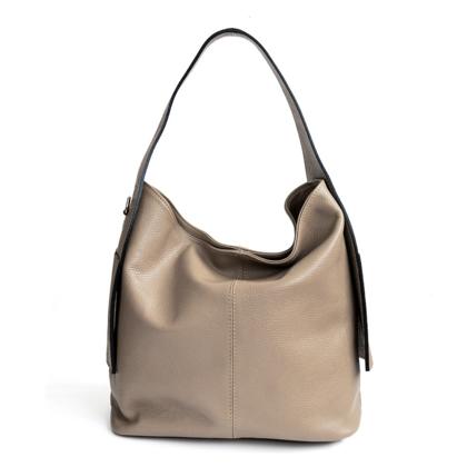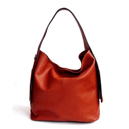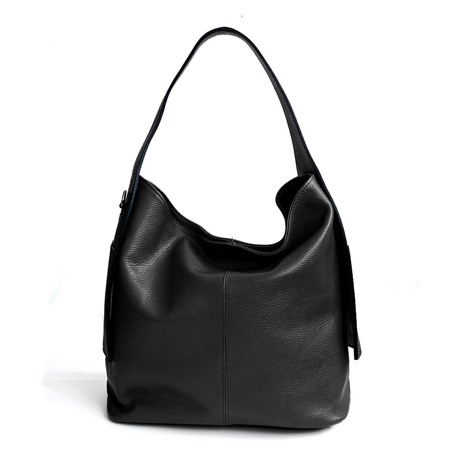 Medium-sized bag made of cowhide leather. Double shoulder strap and magnetic closure. Unlined interior with a pouch.