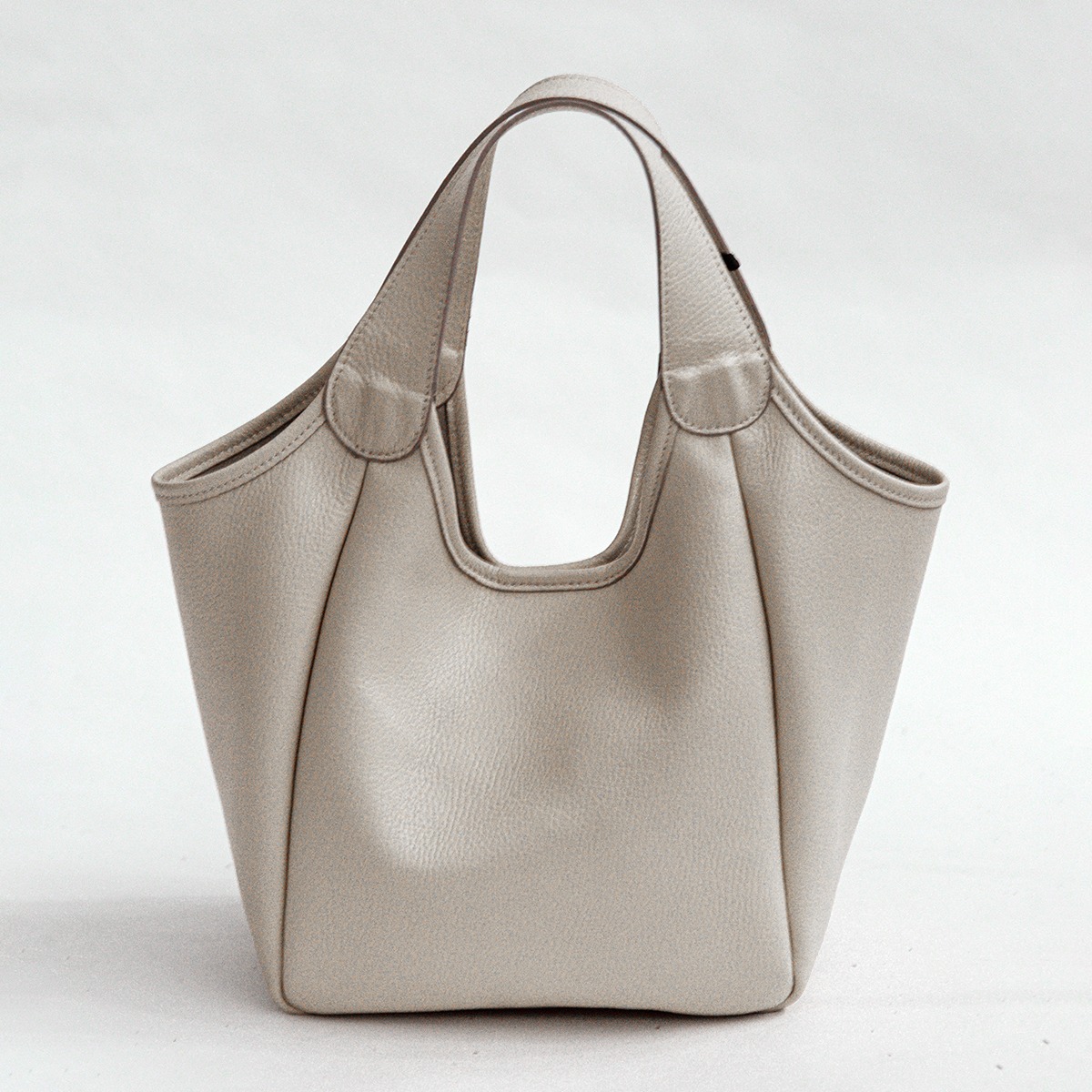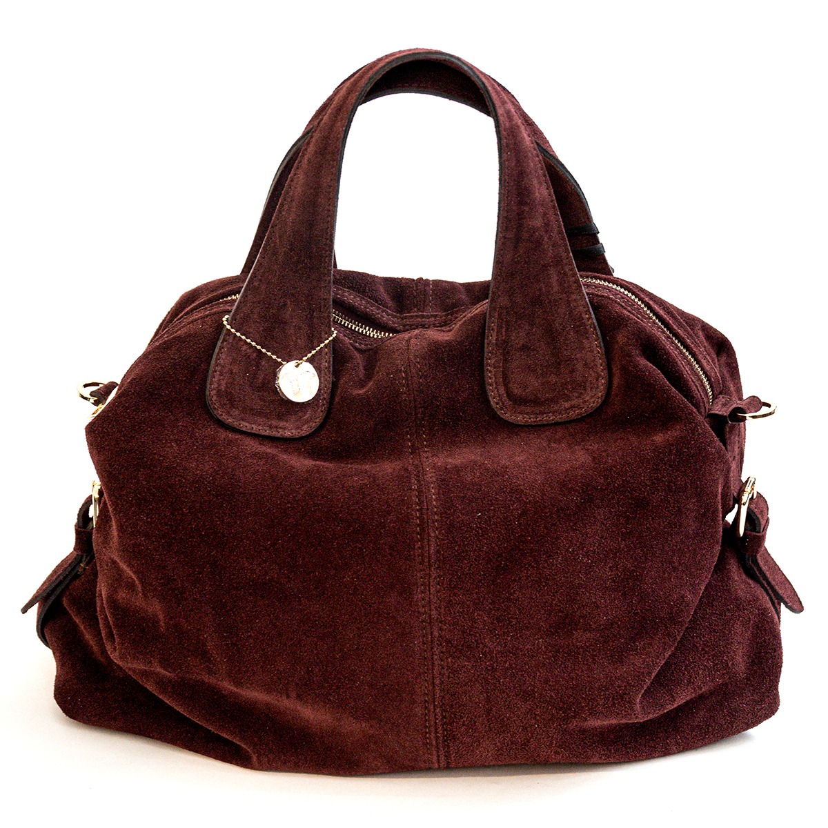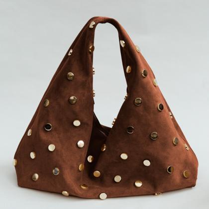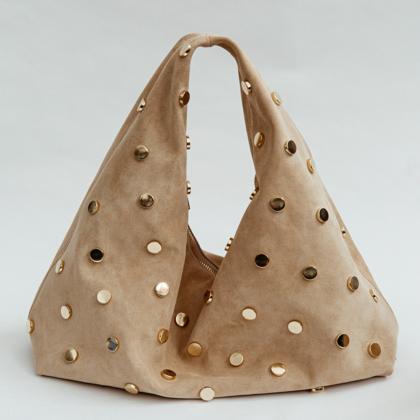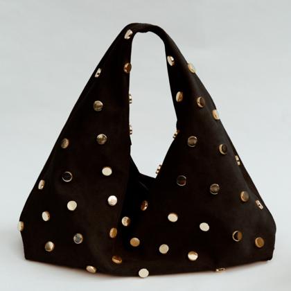 Large, practical, and sporty shoulder bag in cowhide leather. Zip closure with functional external pockets on the handle. Attachable shoulder strap. Silver-colored accessories, studs on the bottom, and a lined interior.